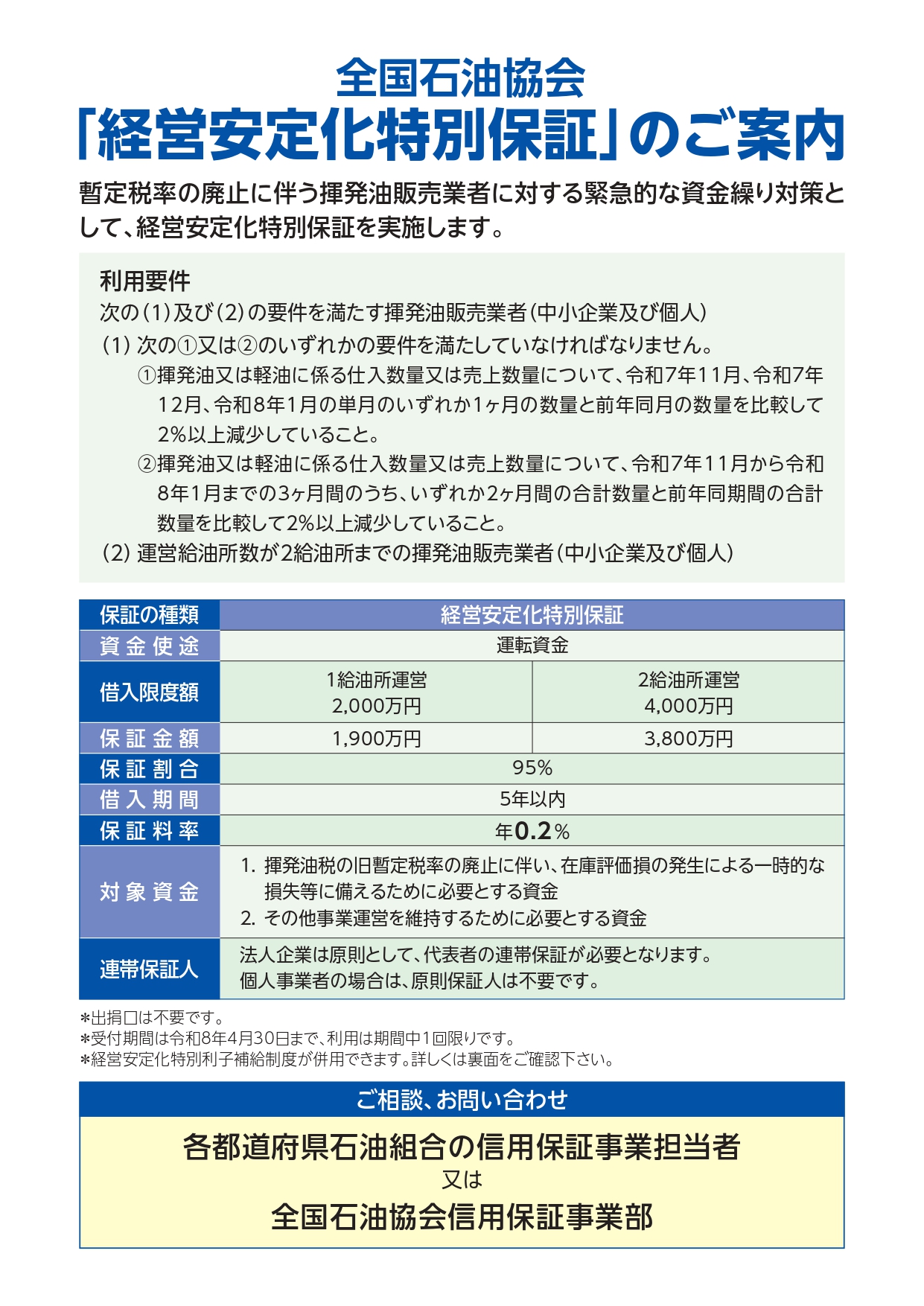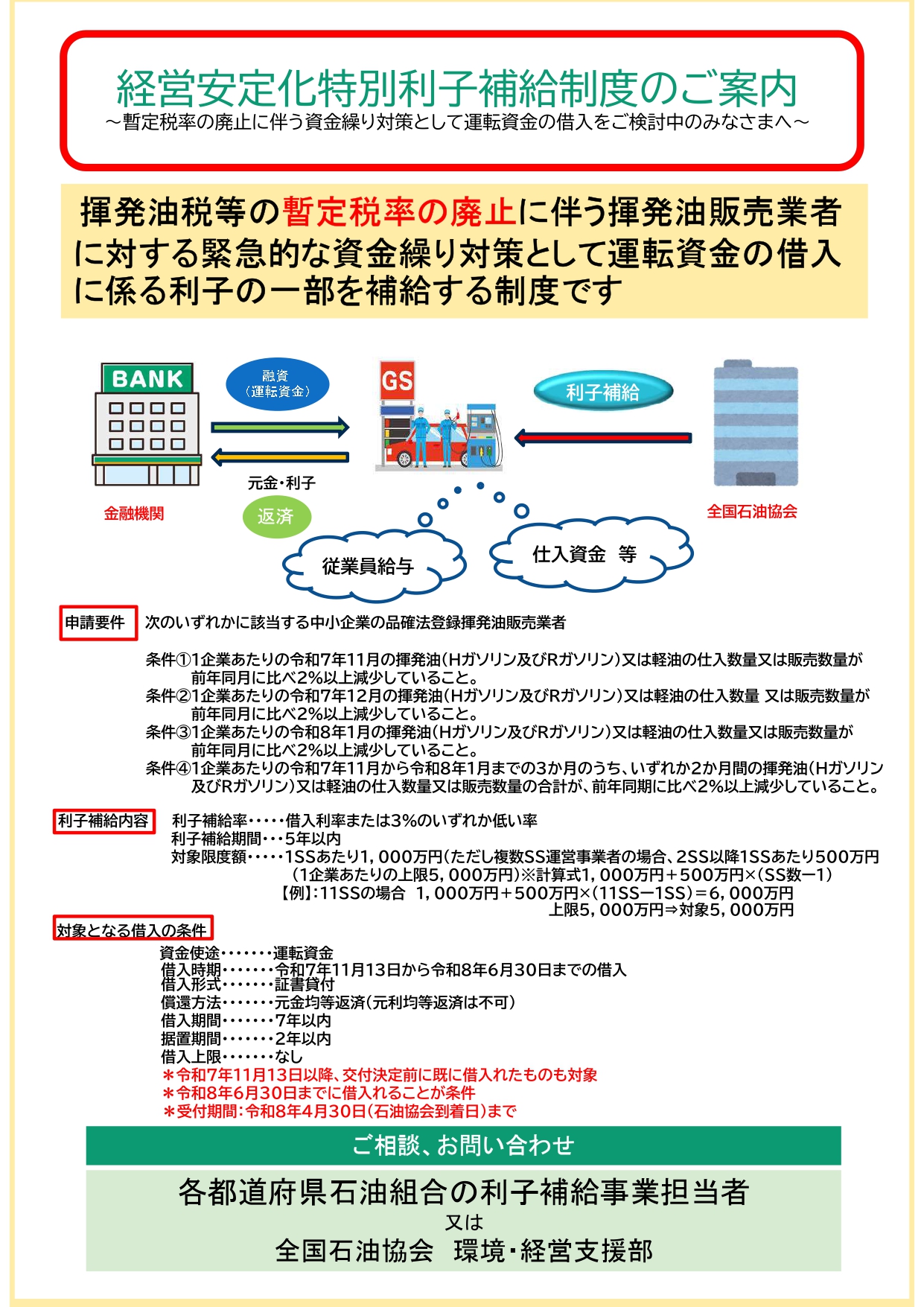 暫定税率廃止に伴う揮発油販売業者に対する緊急的な資金繰り対策として、運転資金借入に係る特別保証制度と特別利子補給制度を実施致します。